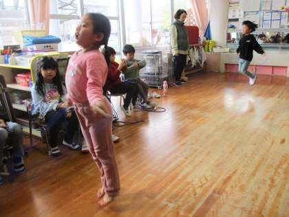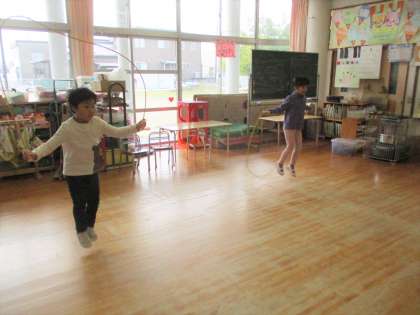 今日は「なわとび大会」でした。これまで、こつこつ練習をして跳べるようになった友達や、自分の最高記録を更新するために挑戦する友達とそれぞれが頑張って練習をしてきました。今日は朝から「絶対1位になりたい!」「やってやる!」と意気込んで登園し、すぐに練習を始めた子供たちです。