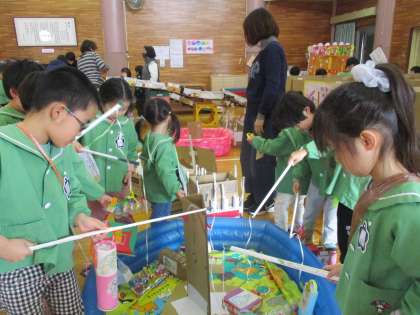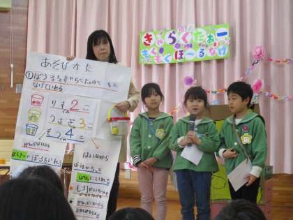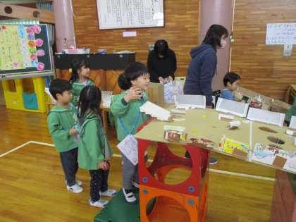 もうすぐ修了するぞう組さんと楽しい時間を過ごしたいと思い、お別れ会をしました。午前中はうさぎ組が考えた「わくわくゲームランド」の4つのコーナーで遊びました。年下の友達に「○○ちゃん次はこっちだよ」「一緒に迷路にいこう」と優しく声をかけるぞう組、うさぎ組の姿が頼もしかったです。