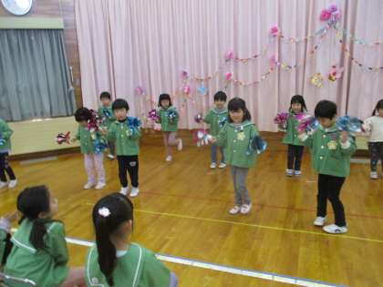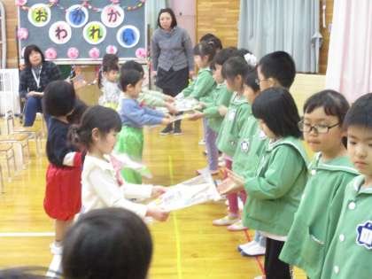 給食の後、うさぎ組の進行でお別れ会第2部をしました。はじめにりす組さんが「ブースカパーティ」を元気いっぱいに踊りました。かわいらしい姿に、見ている友達も手拍子で楽しみました。次に、うさぎ組がおめでとうの気持ちを込めて「おめでとうを100回」を踊りました。そのあとはプレゼントタイム。ぞう組さんにありがとうの気持ちを込めて、りす組からは星形のフォトフレーム、うさぎ組からは鉛筆立てをプレゼントしました。気持ちのこもったプレゼントをもらい、嬉しそうなぞう組さんでした。
