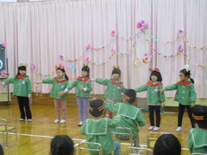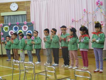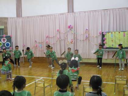 ぞう組さんからも出し物がありました。サンタさんにもらったことわざかるたの中から、好きなことわざを発表してくれました。「あ」や「か」などひらがなを1文字言うと、そのことわざを瞬時に言えるぞう組さんに驚きでした。他にも、得意なことの発表でブリッジやクモ歩きを見せてくれたり、女の子チーム男の子チームに分かれて踊りを見せてくれました。最後に、発表会の「かさじぞう」のように幼稚園で楽しかったことの発表がありました。「運動会のリレーが楽しかったね」「レモネード屋さんが楽しかったね」と、1人1人が発表をしました。ぞう組さんの話を聞き楽しい気持ちやうれしい気持ちと、もうすぐお別れであることを感じて少し寂しい気持ちにもなったりす組・うさぎ組でした。でも、まだ明日もお別れ会第3部で、楽しいことがありますよ。ぞう組さんが修了するまで楽しい思い出を1つでも増やしていきたいなと思います。
