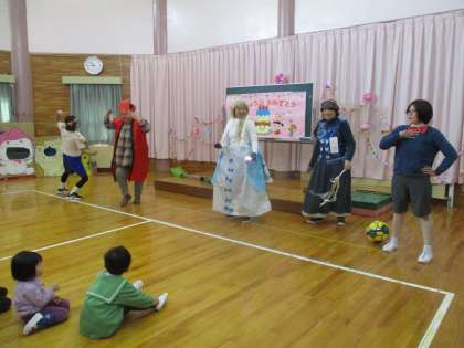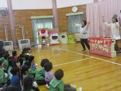 今月のお楽しみコーナーは、職員による「速星劇団」です。年長組が発表会でした「かさじぞう」の話を先生たちが演じます。年長児は自分演じた役の先生を真剣に見ている姿が印象的でした。