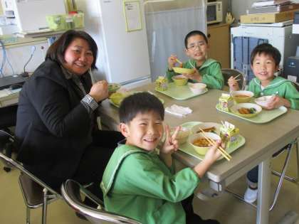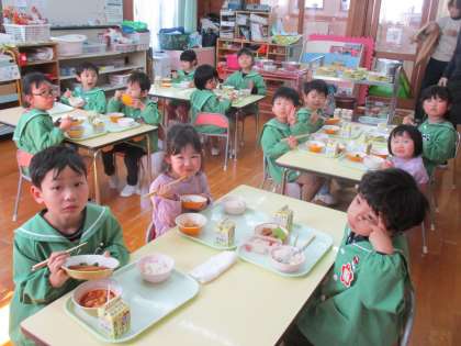 修了式まで、残り数日となり今週は幼稚園で食べる最後の給食です。子供たちのリクエストで、思い出の年少組の保育室や、園長先生のいる職員室へグループごとに交代で行き、給食を食べています。また、年長組には他のクラスの先生たちが食べに来てくれ、子供たちとの会話を楽しんでいます。「年少の頃はあまり食べられなかったのに、こんなに食べられるようになったんだね」「朝は、よく泣いていたね」と、思い出を話されると、照れくさそうに聞いている姿がかわいいです。