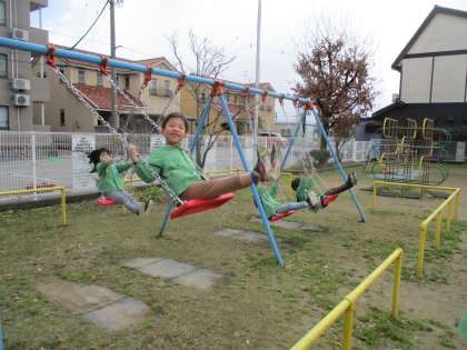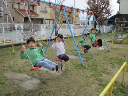 園庭のブランコの一部を取り換えしたため、修了式の練習後、園庭で遊びました。新しくなったブランコで高くまで漕いで嬉しそうな年長組でした。たくさん遊んだ園庭や各保育室にお別れをしにみんなで回ってきました。