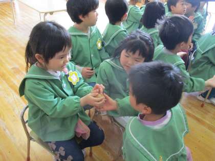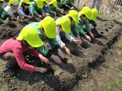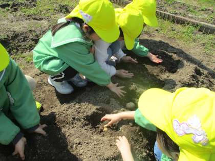 来年度のカレーパーティで使う、じゃがいもの種芋を植えました。「じゃがいもは何からできると思う?」と聞くと、「種からできると思う」と言っていた子供たち。絵本を読み、種用の芋から芽が出たり根っこが伸びて実がなることを知ると「えーっ、知らなかった!」「じゃがいもからひげ(根っこ)が伸びるんだ」と驚いていました。種芋に触れたり、匂いを嗅いだりしてから、畑に種芋を植えました。絵本では、1つの種芋から10個以上のじゃがいもがなっていました。幼稚園では、いくつ収穫できるか楽しみですね。