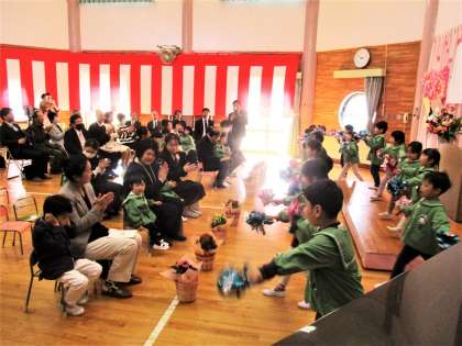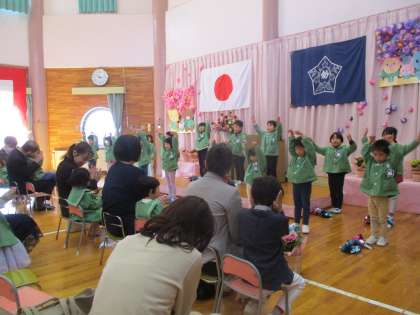 年長組さんは、歓迎会でこれまで練習してきたリズムや歌を堂々と披露しました。入園した友達もお家の方と一緒に真似をしていて楽しそうでした。