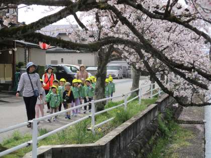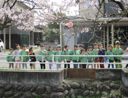 幼稚園近くの坪の川の桜を見に行ってきました。3月末に通った時にはまだ咲いていなかった桜が満開で「わぁきれい」と歓声があがっていました。そのあと、スポーツプラザ公園まで行ってきました。