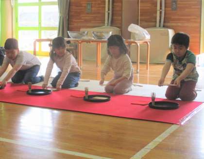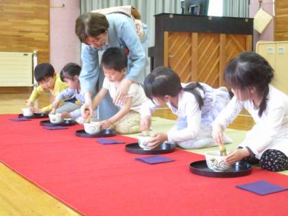 4月お茶教室(5歳児) 公開日 2024/04/15 更新日 2024/04/15 今日のできごと 4月15日(月) 年長組になって初めてのお茶教室をしました。「抹茶飲めるかな」「どんなことするのか楽しみだな」と緊張と期待とでいっぱいの子どもたちでした。桜型のお菓子をいただき、自分で点てたお抹茶を飲んでおいしい時間を過ごしました。