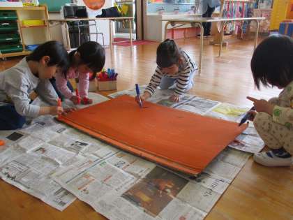 先週から段ボールにローラーを使って色を塗り、冷蔵庫をつくっています。両開きの扉にしたいという子どもたちの思いから扉を2枚つくり、今日はマジックで絵を描くことを楽しみました!