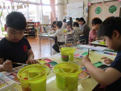 自分の絵の具セットを使って色を塗りました。絵具のチューブから絵の具を出すこと、筆を使って水と混ぜながら色の濃さを変えること、混色をすることと一つ一つに「すごーい」と歓声があがっていました。画用紙につくった色をぬってみて「きれいな色になった」と満足そうな子どもたちでした。今後も、絵具を使った絵画制作に挑戦していきたいと思います。