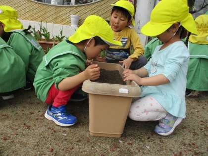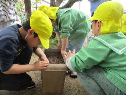 今日は「ニンジンの種はこんなに小さいんだね」とじっくり見ながら「大きくなってほしいな」と願いながら植えました。芽が出ることを楽しみにしています。