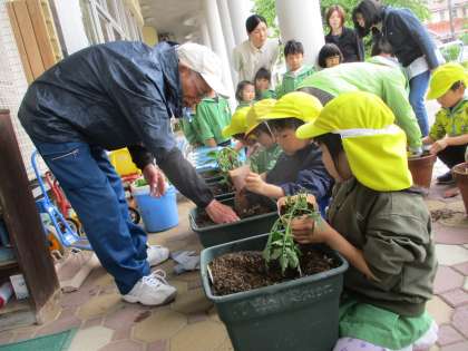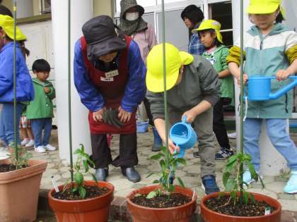 長寿会との野菜の苗植え(5歳児) 公開日 2024/05/08 更新日 2024/05/08 今日のできごと 5月8日(水) 速星地区の長寿会の方と野菜の苗を植えました。 自分で育てたい野菜を一人一つ決めて植えました。どんなふうに植えるのか聞きながら、丁寧に植える子どもたちでした。長寿会の方に「水をあげる時間」「水の量」「水やりの他にどんなお世話をしたらいいのか」を質問し、教えてもらいました。「明日からお世話を頑張る」と気合十分の子どもたちです。
