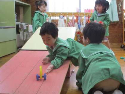 作ったブロックを坂に転がして遊んでいます。「すべりだいみたい」「ころがった!」「あれれ?ころがる?」何度も試している子供たちです。