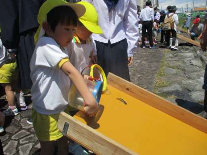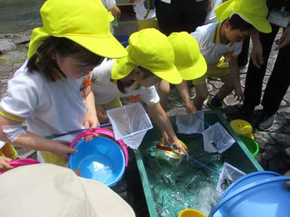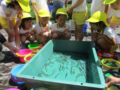 速星地区こども自然ふれあい体験(稚鮎放流)5歳児 公開日 2024/05/16 更新日 2024/05/16 今日のできごと 5月16日(木) こども自然ふれあい体験(稚鮎放流)に参加しました。稚鮎を近くでみると活きがいい稚鮎に少しびっくりしている様子でしたが、タモですくって坪野川に放すことを何度も楽しむことができました。「大きくなってね」「戻ってきてね、まっています」と声をかける子どもたちでした。