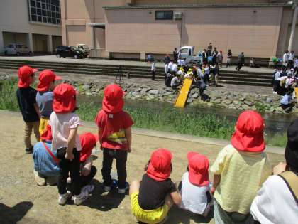 今日は、稚鮎放流の様子を見に行ってきました。川を挟んだ向かい側から5歳児の姿を見ながら、来年は自分たちだと楽しみにしていました。