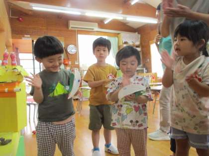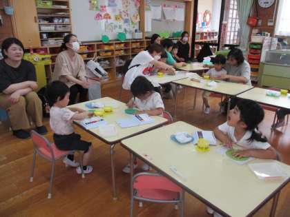 14日より自由保育参観があり、保護者の方が見てくださっていることが嬉しそうな子供たちです。のり貼りができるようになったので、カエルの顔のパーツをのり貼りしカスタネットを作りました。今回は、これまでより少し大きな形だったこともあり、周りにだけのりを塗る方法を知らせると、人差し指をクルクル動かしながらのりをのばして丁寧に作業していました。完成すると「カチカチカチ♪」といい音がして嬉しそうでした。歌に合わせてリズムをならして楽しみましょうね