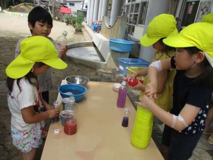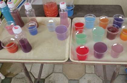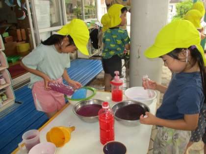 色水遊び(5歳児) 公開日 2024/06/25 更新日 2024/06/25 今日のできごと 6月25日(火) 色水遊びを楽しんでいます。赤・青・黄の3色を混ぜて「どんな色になるのかな」と試しています。色水の割合の量を変えたり、水を入れて濃さを工夫していました。自分で混色した色水の中で「今日の1番」を決めてクリアカップに入れました。