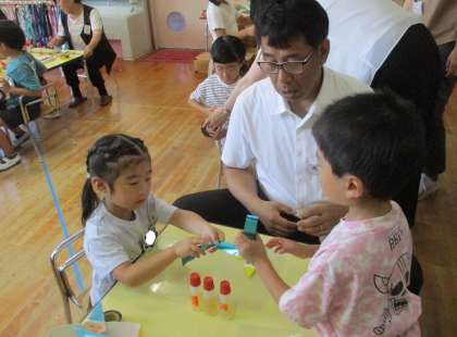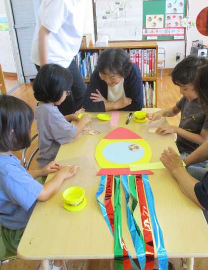 七夕飾りをつくりました(4歳児・5歳児) 公開日 2024/07/05 更新日 2024/07/05 今日のできごと 7月5日(金) 長寿会の方や関係者評価委員会の方と一緒に七夕飾りをつくりました。年長、年中児は同じグループになったお客様と一緒に会話をしながら楽しくつくる姿が見られました。完成した飾りを幼稚園の笹竹に飾り、出来上がった飾りを見ながら集会を楽しみました。