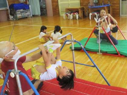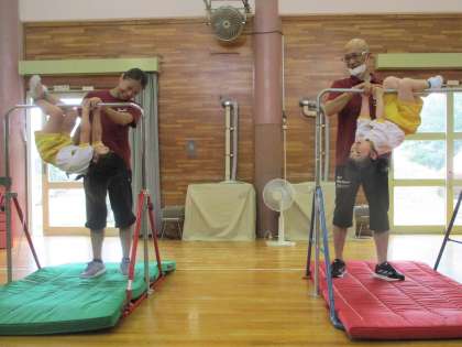 今日の体操教室は鉄棒でした。「ぶら下がり」「ぶたの丸焼き」「足抜きまわり」「つばめ」に挑戦しました。初めてのことも多かったのですが、講師の先生に支えてもらいながら頑張っていました。
