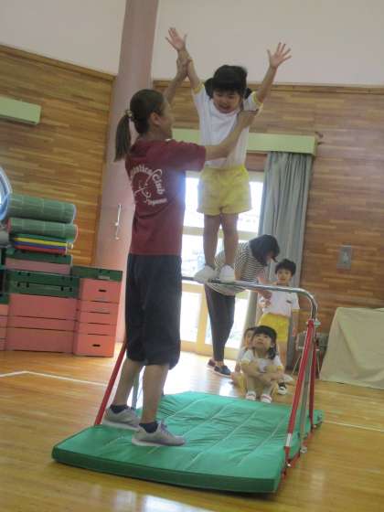 最後に、鉄棒の上に立ち上がってドキドキしながらも“ジャ〜ンプ!!”挑戦する気持ちは大切ですね!