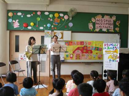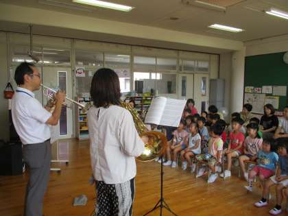 8月誕生会 公開日 2024/08/30 更新日 2024/08/30 今日のできごと 登園日、最終日。今日は8月生まれの誕生会があり、みんなでお祝いしました。お楽しみコーナーでは、保護者の方によるトランペットとホルンの演奏でした。『さんぽ』や『君をのせて』等、素敵な演奏に聴き入っていました。また、トランペットの音の出し方やホルンの持ち方も教えていただきました。