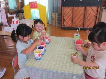 夏休みに経験したことや食べて美味しかったものの話を聞いていると、かき氷やアイスが人気でした。早速、かき氷で遊べるようにしたところ「ガリガリガリガリ…」と言いながら氷を削って、かき氷の完成です!頼みすぎて順番に食べていた子もいます。