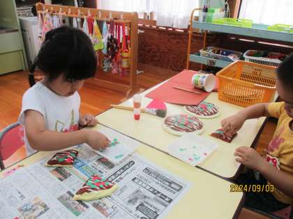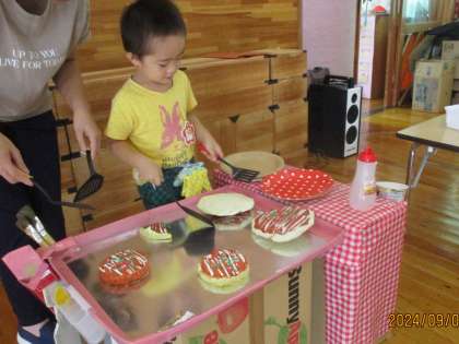 またお好み焼きもつくって遊んでいます。今にも、ソースのいい匂いがしてきそうですね。フライ返しは、1学期のパンケーキ作りで慣れたものですが、お好み焼きが少し大きくなったので、ひっくり返すことを練習中です。少しずつ園生活を思い出しながらたくさん遊びましょうね。