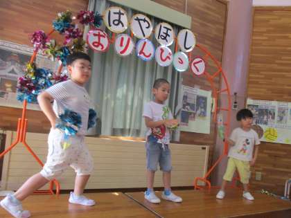 ダンスコーナーで、年上の友達と踊ったり、バスケットのゴールをめざしてシュートしたり、鉄棒で長くぶら下がったりして、自分でやりたいことをみつけて楽しんでいます。年上の友達の姿が刺激になっているりす組です。