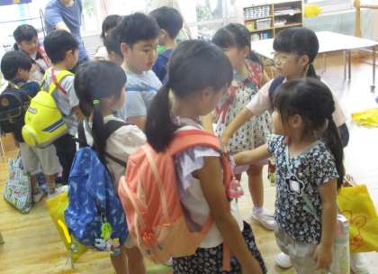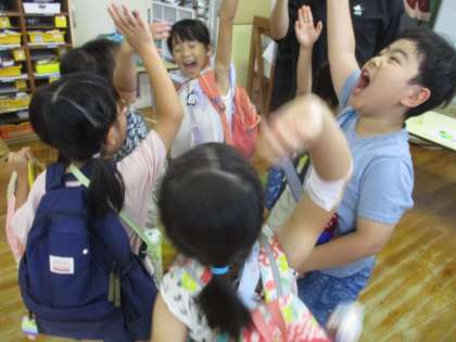 今日もリレーや玉入れをし「赤団には負けないぞ」「白団が勝つ」と闘志を燃やす子どもたちでした。帰りの会では円陣を組んで、気合を入れ合いました。