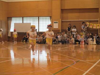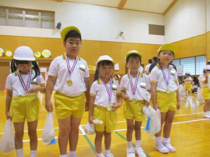 運動会頑張ったね(年長児)No.1 公開日 2024/09/28 更新日 2024/09/28 今日のできごと ずっと「あと〇日」と指折り数えてきた運動会。登園してくるとドキドキ、ワクワクした表情の子どもたちでした。オープニングから笑顔いっぱい、いろいろな競技にやる気があふれる姿がとても素敵でした。運動会では競技の他にも係りで役割があり、堂々とする姿が頼もしかったです。 閉会式では園長先生より金メダルをもらい、うれしい笑顔があふれる運動会となりました。