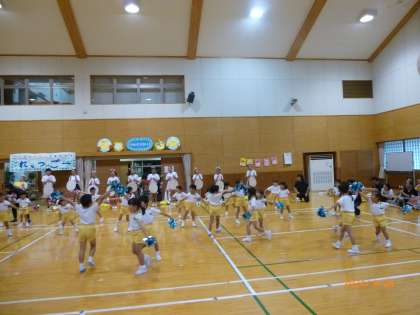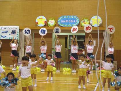 オープニングは「速星幼稚園の50周年お祝いダンス」です。「レッツゴー速星幼稚園、Go!Fight!Win!」と、子どもたちの元気なかけ声が響き、全園児で元気いっぱい踊ることができました。