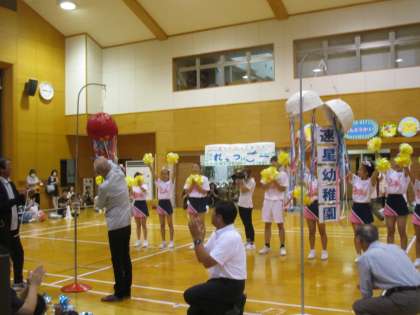 チアリーディングチーム「パピーズ」の皆さんにも会場を盛り上げてもらい、レベルの高い演技に子どもたちも驚いていました。いつもお世話になっている地域の方々には、くす玉を割っていただき会場がより華やかになりました。みんなでこの節目を一緒にお祝いでき、素敵な運動会のスタートとなりました。