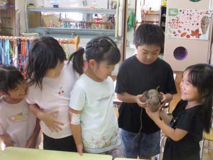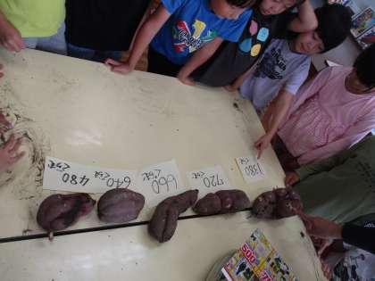 サツマイモ堀りをして「いちばん大きい芋はどれくらいの重さだろう」と測ることにしました。掘った芋の中から大きい順に5個芋を決め、1つずつ手で持って「どっちが重い」と感じながら重さを予想しました。実際測りに乗せて重さがわかると「わぁやっぱり重かったもんね」と納得したり、芋の長さや、太さで重さが違うことの不思議さも感じる子どもたちでした。