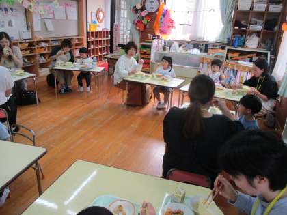 今日は、給食試食会がありお家の方と一緒に給食を食べました。いつも以上に張り切っている子が多く、苦手な物も口に入れている姿にびっくりされるお母さん方でした。