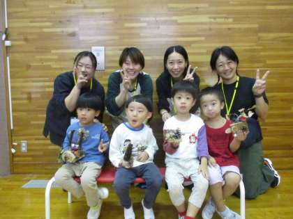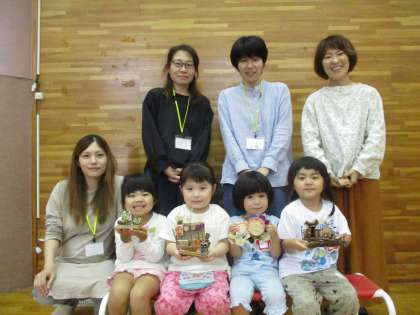 給食の後は、親子活動で自然物を使ってオブジェ作りをしました。いろいろな木の実や枝を組み合わせ思い思いの作品が出来上がりました。お母さんと相談しながら和気あいあいと進める姿が微笑ましかったです。素敵な作品になりましたね!