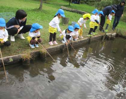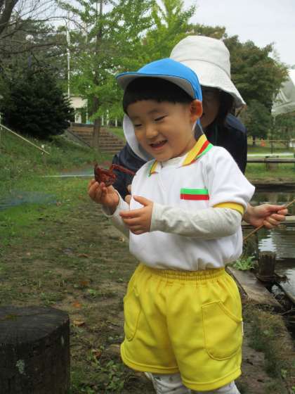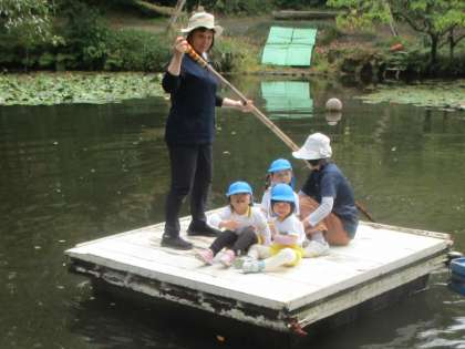 年長組の友達のザリガニ釣りや、いかだ遊びの様子をじっくり見学した後、りす組も挑戦したことで安心して活動することができました。ザリガニを持つことができた友達や、ターザンロープに挑んだ友達がいて驚かされました。また、いかだに乗る前は緊張気味だったのに、みんなと乗ったら全然怖くないことも感じることができ、笑顔も見られました。