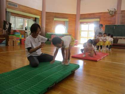 今月の体操教室はマット遊びでした。3枚の長いマットの上をお芋ゴロゴロ・・・と転がり、次は友達と二人で手をつないでゴロゴロ・・・一緒に転がるとまた楽しそうでした。最後は“でんぐりがえし”をかっこいい言い方で「前転」と言うことを教わり、実際に手を付く場所、どこを見て回転するかなど、ポイントを教えてもらいながらやってみました。回ることを嫌がる子が少なく、前回よりも成長を感じました。