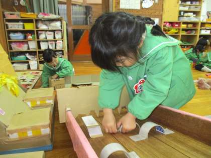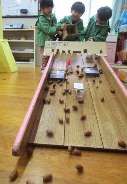 近所の方から大きなどんぐりをいただき、転がし遊びをしています。最初は1つずつ転がしていたのですが「全部転がしたい」と言った友達がやってみると、迫力もあり転がる音も軽快で盛り上がりました。いろいろな形のトンネルをつけて転がしています。また、坂の角度やどんぐりの形が関係しているのか、どんぐりが風車のように回りながら滑ってくるのが面白く何度も繰り返し楽しんでいます。♪どんぐりころころ〜お池にはまってさあ大変!♪と歌いながら、転がしては拾い集める子どもたちです。わざわざ届けてくださりありがとうございます。