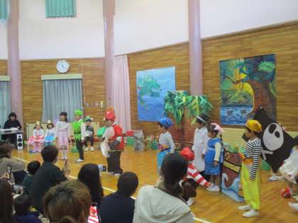 プログラム2番は、劇「ピーターパンのぼうけん」をしました。役になりきって演じることが練習を重ねる毎に楽しくなってきていました。今日は「かっこいいところを見せたい」「セリフを大きな声で言おう」とそれぞれに目標を決めて取り組む姿が見られました。