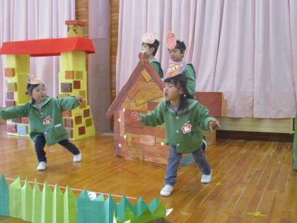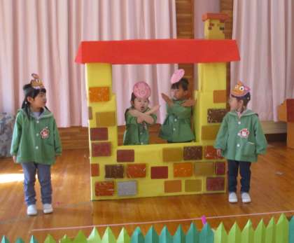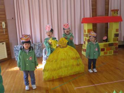 生活発表会後、ようやく全員が揃い楽しみにしていた「劇遊び」をしました。役を変えて選んだ友達もいれば自分の役で参加した友達もいます。友達のことをよく見ていたことが伝わる言葉や仕草で驚かされました。「オオカミ楽しかった!」「次は、1ちゃんにしたい」と次にやりたいことを口にしており、子どもたちにとって楽しい劇ごっこだったことが感じられ嬉しく思っています。