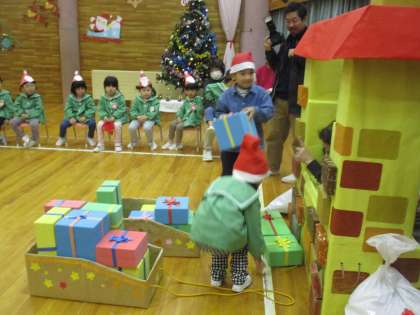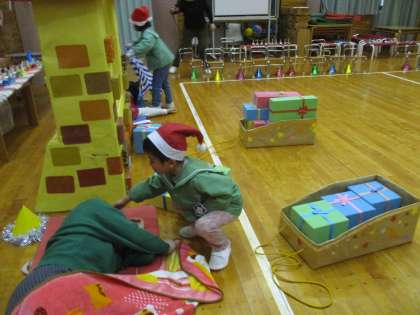 「プレゼントを運ぼう」のゲームでは、子ども役の先生の家に行き、頭を撫でて「メリークリスマス!」と言って、プレゼントを置いてくるゲームをしました。寝ていた子(先生)を起こさないよう、優しく撫でたり、そっとプレゼントを置いたりする姿がとてもかわいかったです。
