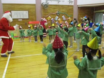 サンタさんに早く会いたくて「待ってますクリスマス」を歌おうとしていると・・・鈴の音と共に、サンタさんがやってきました!大きな歓声があがり、サンタさんも一緒に踊りました♪