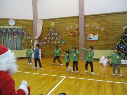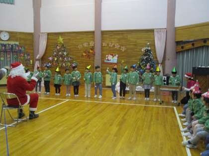 クリスマス会☆4 公開日 2024/12/18 更新日 2024/12/18 今日のできごと プレゼントのお礼に、クラス毎に出し物を披露しました。サンタさんは「とても嬉しい!きれいなベルの音で幸せな気持ちになったよ、ありがとう」と言ってくれました。子どもたちもサンタさんに見てもらい嬉しそうでした。