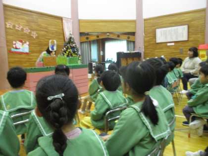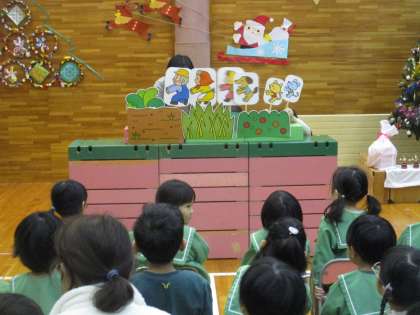 12月のお楽しみ会をしました。「大きなカブ」のペープサートのお話を見て「うんとこしょ どっこいしょ」と掛け声を一緒にしながら楽しみました。