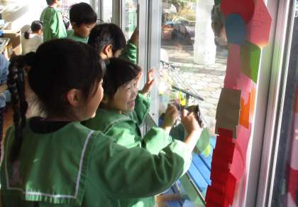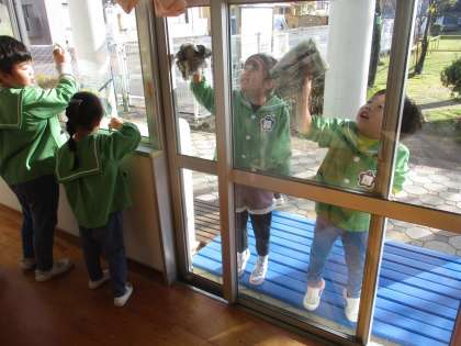 2学期も終わるし、新しい年を迎えるのに『大掃除』をしようということを話し合い、今日は窓拭きをしました。自分たちのクラスの窓をピカピカにしようと磨いていると「幼稚園のほかの窓も磨こう」ということになり、遊戯室や職員室の窓も張り切って磨く子どもたちでした。「明日はどこを掃除する」「床ふこうよ」と話していました。『園内大掃除隊』の年長児です。