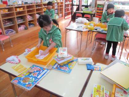 昨日、りす組の大掃除をしました。自分の道具箱の中や外、遊具棚、机や椅子を雑巾で拭きました。手順を知らせると、その通り進め「ピカピカになった〜」と嬉しそうでした。みんなできれいにして新年を迎える準備もできました。