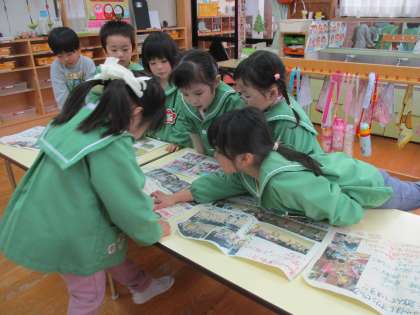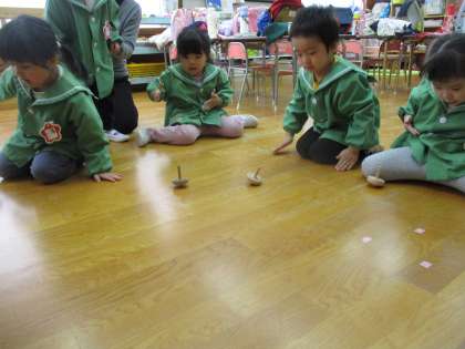 今日は、2学期を振り返って楽しかったことや頑張ったことを話したり、掲示していた写真を見たりしました。「あ!かき氷屋さん楽しかったね」「うんうん、お好み焼きもしたね」と、思い出して話す姿も見られました。最後は、みんなでコマ回し!よく回せるようになって3学期は対決しよう、と張り切っています。