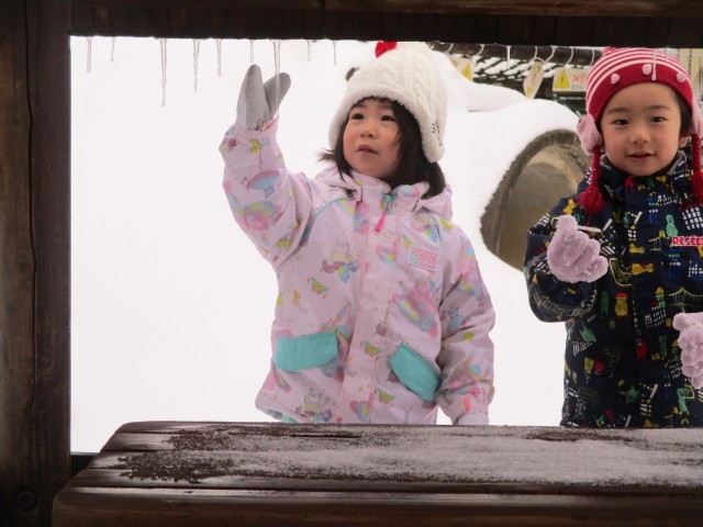 今日の雪遊びは、前回よりも多い雪に大喜び!雪玉を投げたりそりで滑ったりして楽しみました。「園庭の探検をしよう!」と誘うと木製ハウスの屋根の下になんだか細いツルツルしたものが・・・「これなあに?」「あ、見たことあるけどな」と興味津々です。「つらら」をそーっと触るとポキッと折れ「え~!」とビックリ顔の子どもたち。大切に持っても、雪の中に落として見つけられなくなるハプニングもありました。