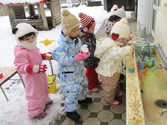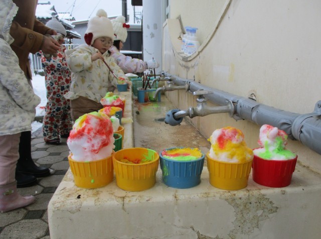 雪をカップに入れると「かき氷みたい」という声から絵の具を準備し色付けして楽しみました。おいしそうなかき氷がいくつも並びました。降園時には、溶けてしまったかき氷にまたまた「え~!」と驚く声が聞かれ、今後も雪遊びを通していろいろな不思議や発見ができそうです。