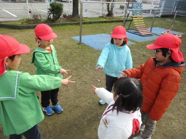 戸外では「ケイドロしよう」「かくれんぼしたい」と友達を誘い楽しんでいます。今日はジャンケンで鬼を決めてかくれんぼをしました。