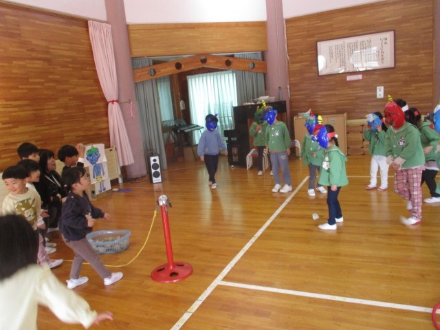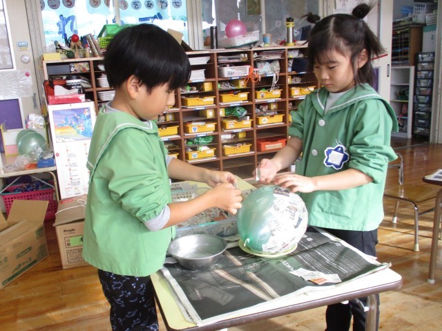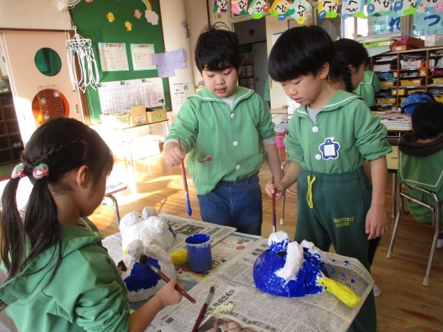 節分にむけ、張り子の鬼のお面をつくりました。出来上がるまでの工程はたくさんありますが「どんなふうに出来上がっていくのか」興味津々の子どもたちは楽しくて「次は鼻や眉をつくるだね」と出来上がりを楽しみにしていました。髪や牙をつけ、お面に仕上がると「りす組さんやうさぎ組さんに見せてくる」とうれしそうでした。「鬼だぞ」とちょっと声を変えたり、怖そうな歩き方をしながらも時々、お面を外して「ぞう組だよ」と言っている子どもたちでした。